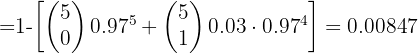Un laboratorio afirma que una droga causa efectos secundarios en una proporción de 3 de cada 100 pacientes. Para contrastar esta afirmación, otro laboratorio elige al azar a 5 pacientes a los que aplica la droga. ¿Cuál es la probabilidad de los siguientes sucesos?