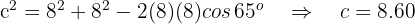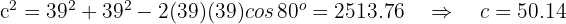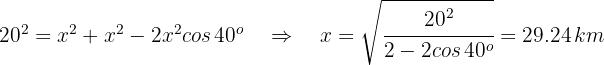Observamos que se trata de un triángulo isósceles. Aplicamos el Teorema de los cosenos