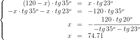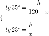 5En cierta ciudad están de obras. La distancia entre dos grúas es de 120 metros. Nos situamos en un punto que se encuentra entre las dos grúas(no necesariamente en el punto medio). Desde aquí observamos el punto más alto de las grúas y vemos que los ángulos que se forman con la horizontal son de 35º y 23º. Si las dos grúas miden lo mismo, ¿cuál es su altura?