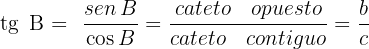 La tangente del ángulo B es la razón entre el cateto opuesto al ángulo y el cateto contiguo o adyacente al ángulo.