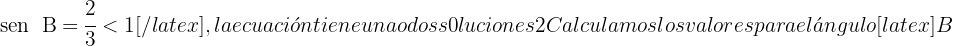 Se trata de un triángulo del cual conocemos dos lados y un ángulo opuesto, por lo que aplicamos las fórmulas obtenidas anteriormente para el tercer tipo de resolución.