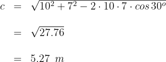 Se trata de un triángulo del cual conocemos dos lados y el ángulos comprendido, por lo que aplicamos las fórmulas obtenidas anteriormente para el segundo tipo de resolución.
