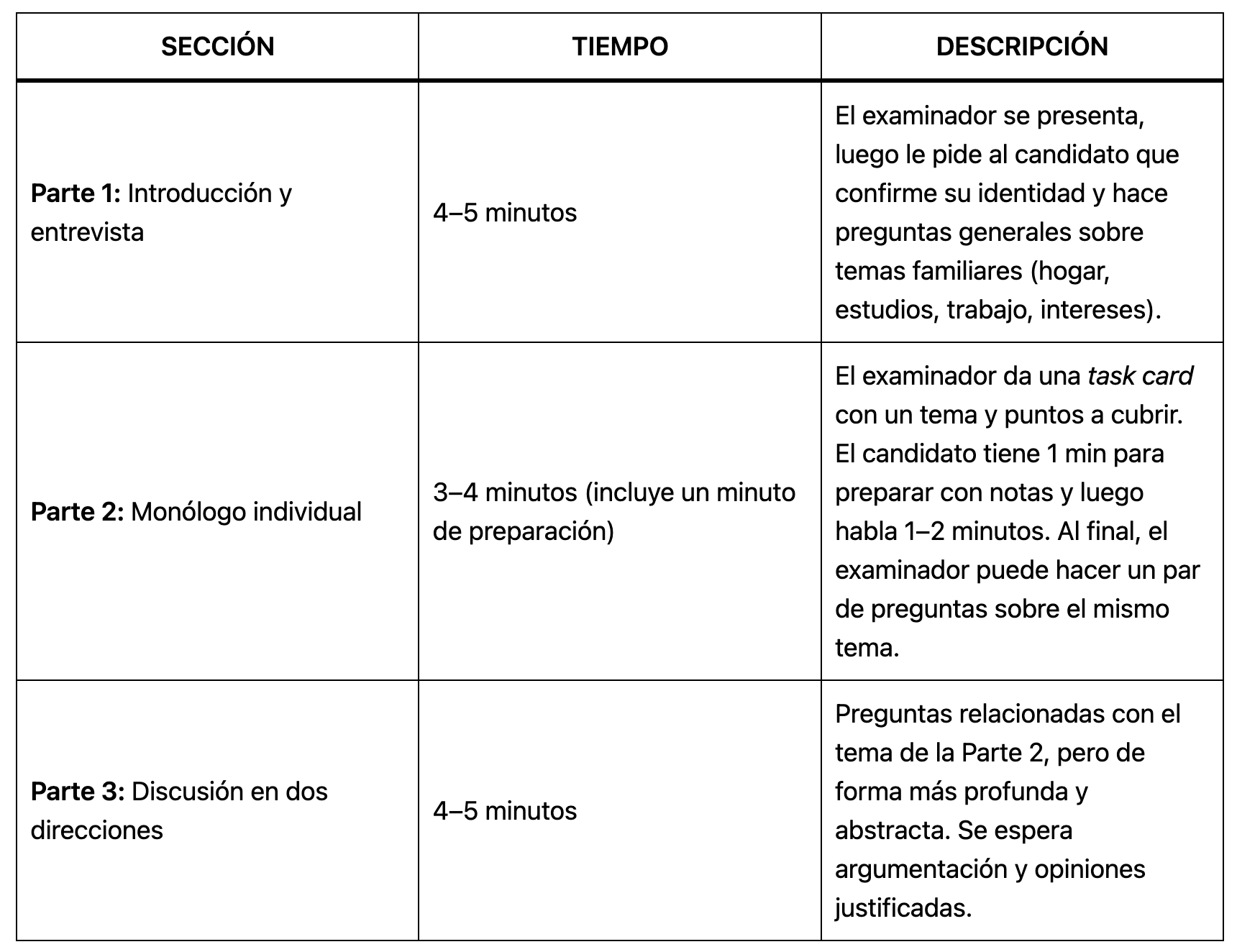 Su objetivo es evaluar tu capacidad para comunicarte en inglés de manera fluida y coherente en diferentes contextos. A lo largo de la prueba, el examinador plantea preguntas y situaciones que van desde temas cotidianos hasta discusiones más abstractas, con el fin de medir tu nivel de vocabulario, la organización de ideas y la habilidad para expresar opiniones y justificar argumentos.