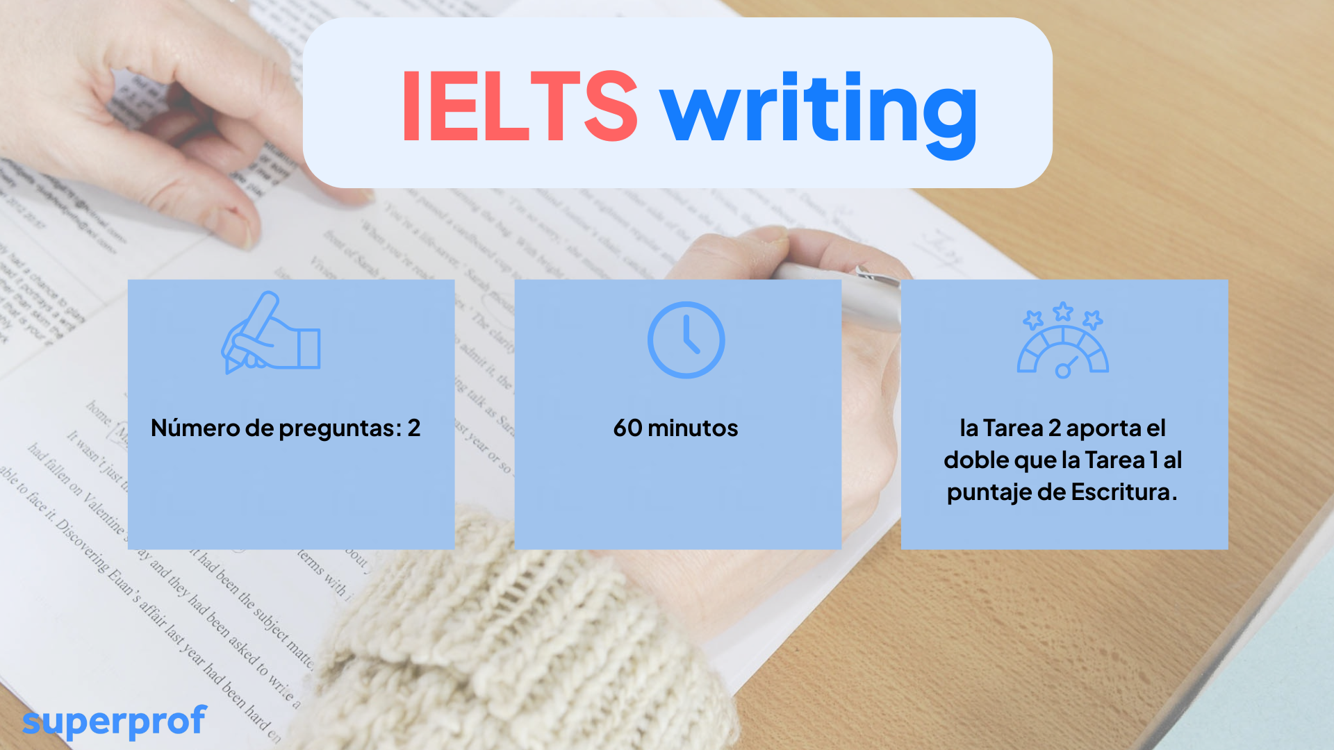 Tipo de tarea | Describir, resumir o analizar información visual: gráficos, tablas, diagramas o procesos. | Redactar un ensayo argumentativo en respuesta a una pregunta o afirmación. |