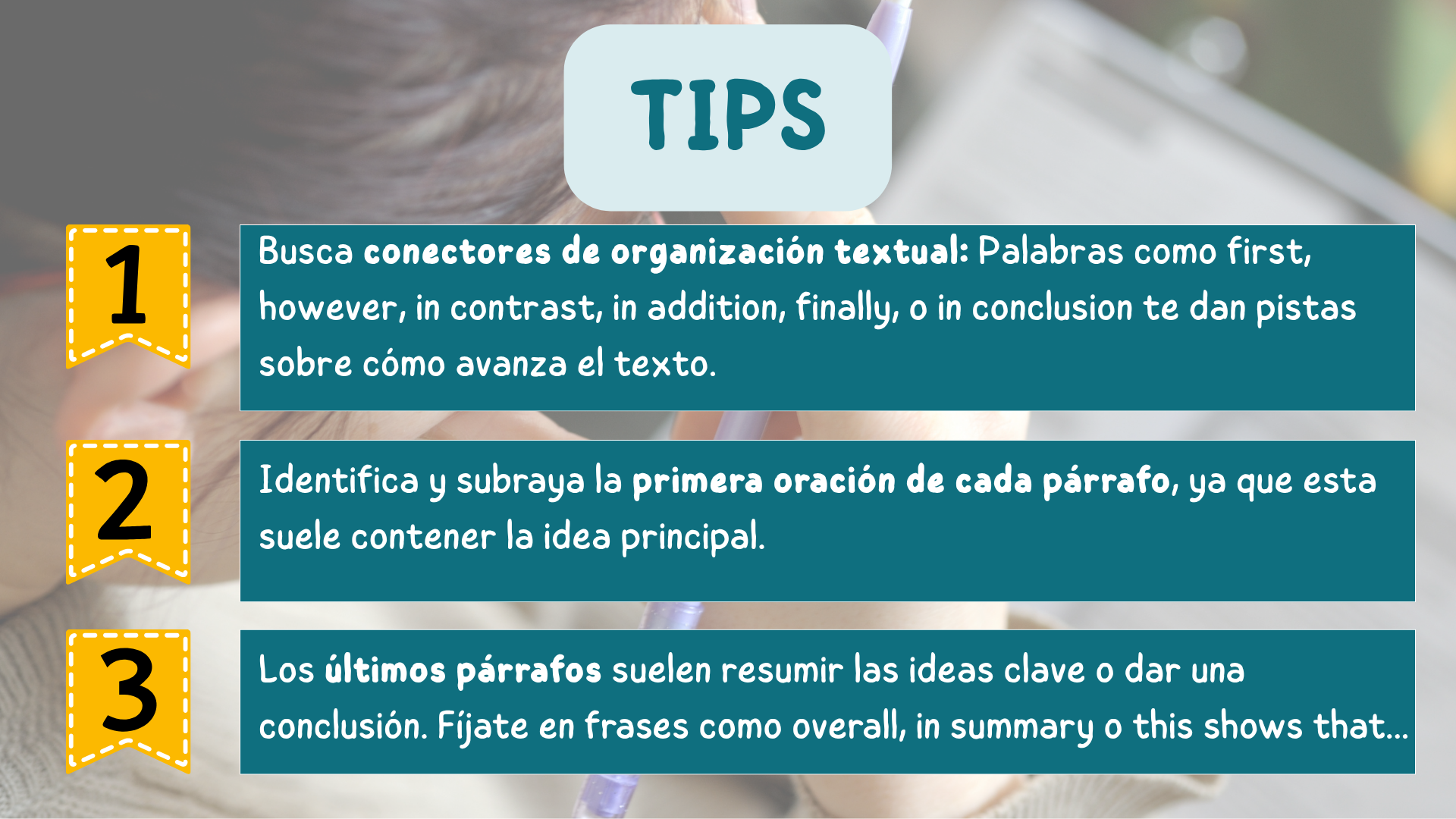 En este examen es clave manejar bien el tiempo. Debes poder identificar rápidamente la idea principal, localizar información específica y distinguir entre ideas generales y detalles.